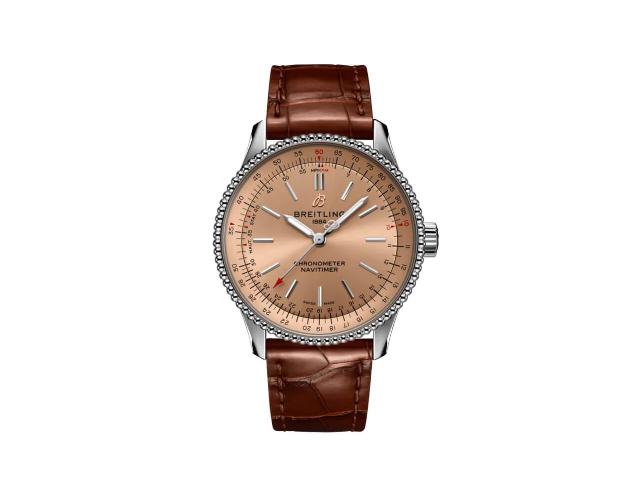 今回ご紹介するブライトリング2020年新作 ナビタイマー オートマチック 35 Ref. A17395201K1P1は、本格的オートマチックウォッチながら、SS製ケースにサーモンピンクの”カッパーダイヤル”、ブラウンの穴留め式レザーストラップを合わせ、女性らしい柔らかさを感じさせる仕上がりです。