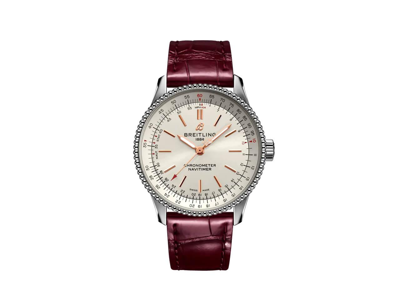 今回ご紹介するブライトリング2020年新作 ナビタイマー オートマチック 35 Ref. A17395F41G1P1は35mmのSS製ケースとバーガンディカラーのアリゲーターストラップ(穴留め式)を合わせた上品な1本です。回転計算尺付きビーズ装飾のベゼル、さりげなくゴールドを用いたインデックスや針が魅力的です。