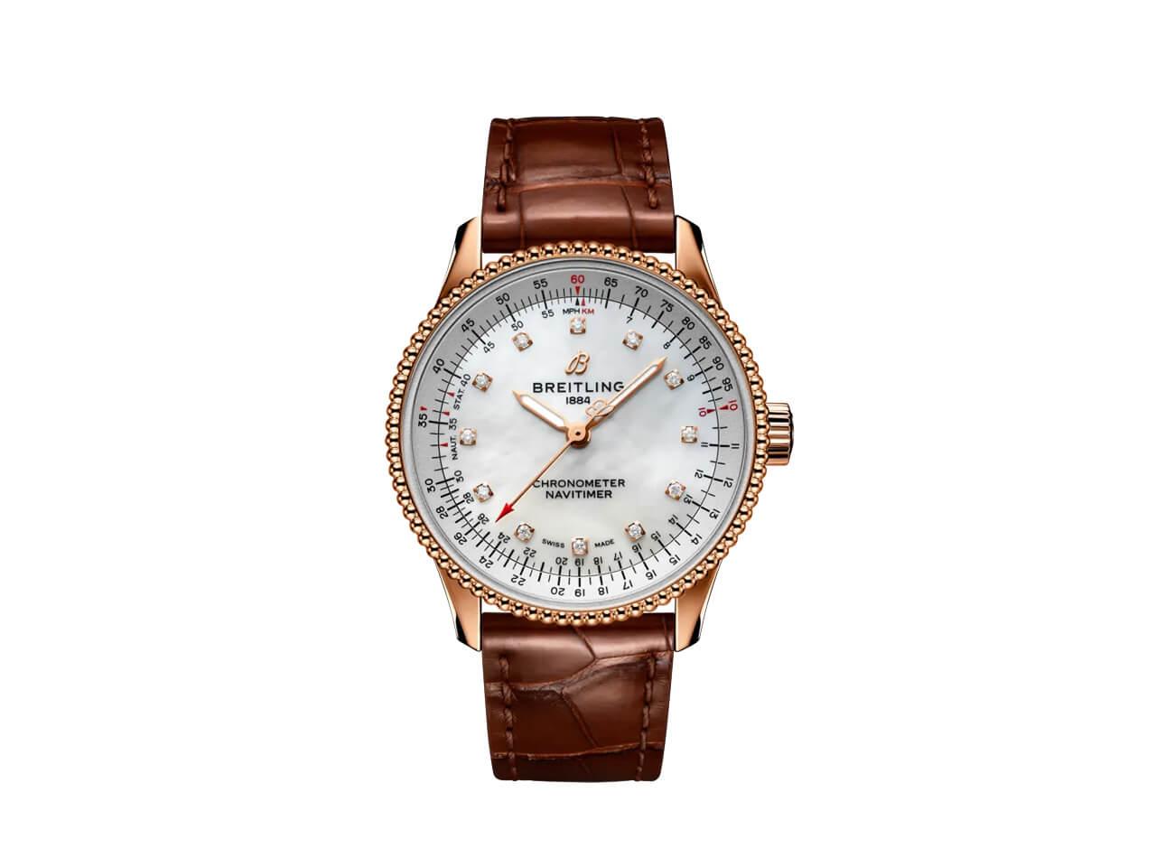 ブライトリングから2020年新作として、女性のための本格機械式腕時計「ナビタイマー オートマチック 35」が登場!今回ご紹介するブライトリング2020年新作 ナビタイマー オートマチック 35 Ref. R17395211A1P1は、18Kレッドゴールドケースに穴留め式のアリゲーターレザーストラップを合わせ、MOPダイヤル(マザー・オブ・パール)のインデックスにはダイヤモンドをセッティングした高級感溢れる上品な1本です。回転計算尺つきビーズベゼルもデザインのアクセントとなっています。