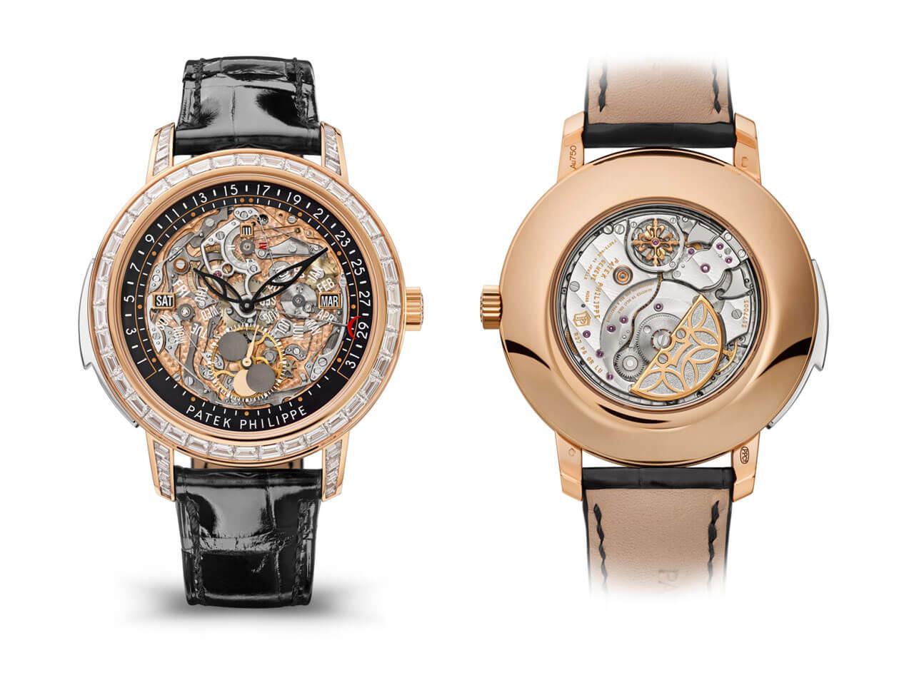 透明な”サファイヤ文字盤”を備えた、最初のパテック フィリップ・グランド・コンプリケーション5104モデルで、2006年にローズゴールド・インサートを備えたプラチナ・バージョンとして発表されました。さらにホワイトゴールド・インサートを備えたローズゴールドのバージョン5304モデルが製作され、今年新しいハイジュエリー・バージョンが誕生したのです。