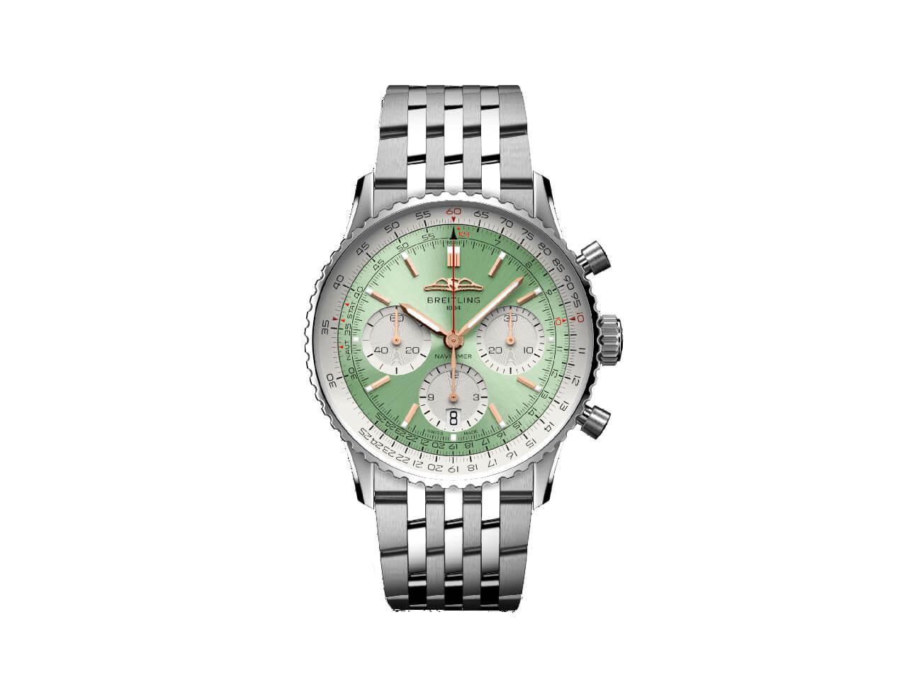 「ブライトリング ナビタイマー B01 クロノグラフ 41」のSS製モデルにはブルー、シルバー、ミントグリーンのダイヤルが、18KRGモデルにはシルバーダイヤルが用意されています。
