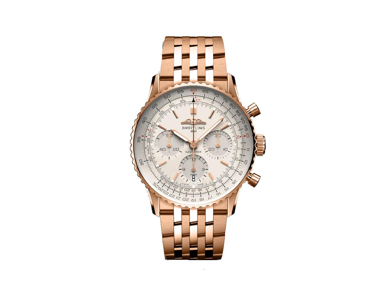 今回のナビタイマーコレクション新作では46mm、43mm、41mmの3サイズ展開で、ケース素材はステンレススティールまたは18Kレッドゴールドが用意されています。