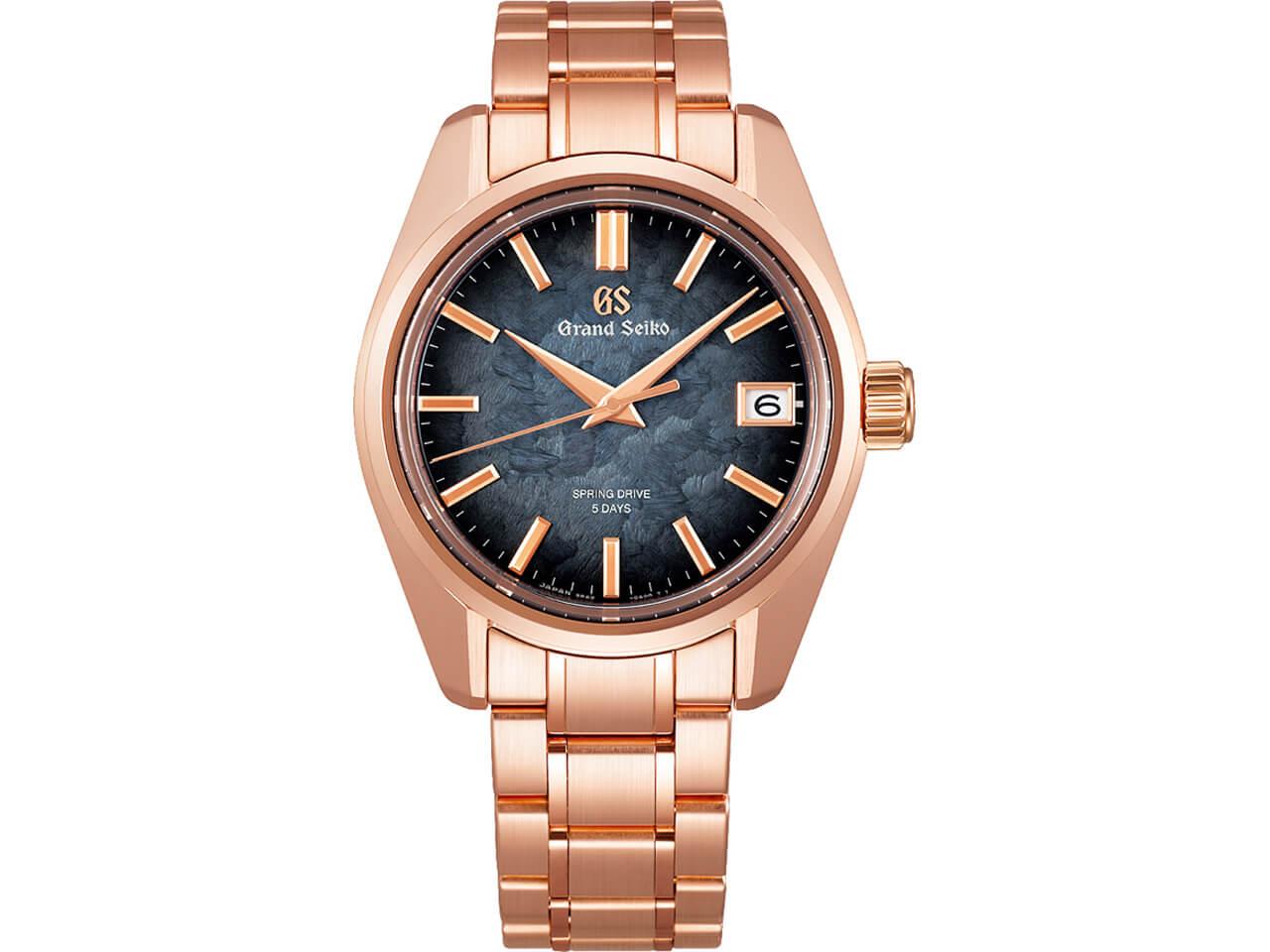 18Kピンクゴールドのフル金無垢仕様の44GSケースに、「信州の日の出」からインスピレーションを得た、というブルーグレーのくすんだカラーリングが新鮮な印象ですね。これまで数々のモデルに採用された「SBGA443”花筏(春分)”」のテクスチャーに通じる質感です。