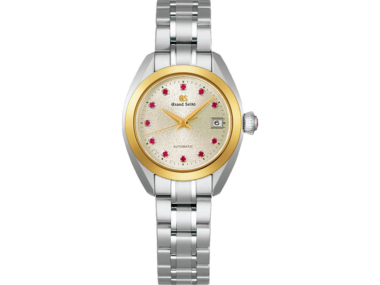 シャンパンゴールドカラーの岩手山ダイヤルに、11ポイントルビーインデックス、3時位置にデイト表示を備えています。リューズトップにもルビーが施され、ベゼルのゴールドカラーともあいまって、可愛らしさの中にも豪華さが漂う1本となっています。グランドセイコーのルビーモデルはなかなか珍しいですね。